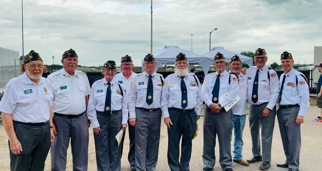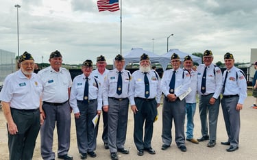 Members of the Honor Guard Left to Right: Pete Waldner, Jim and Donna Puthoff, Mike McGoffin, Dale Hill (former Commander), Patrick Branco (current Commander), Dick Moss (1st Vice Commander), Darrel Kluge, "Big" Al Arndt, Terry Wolf.