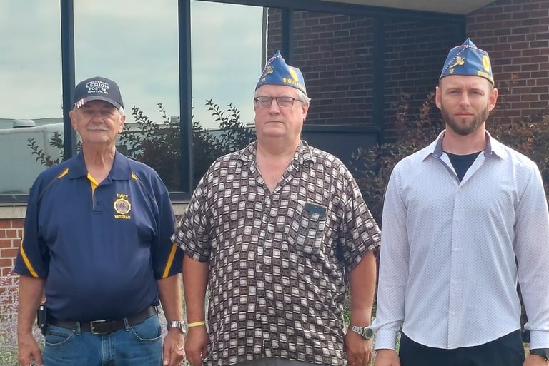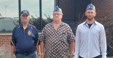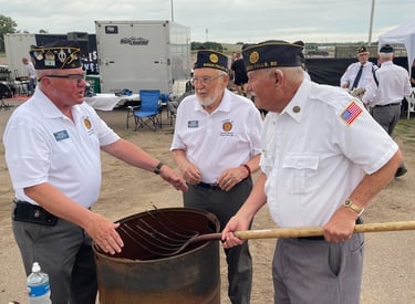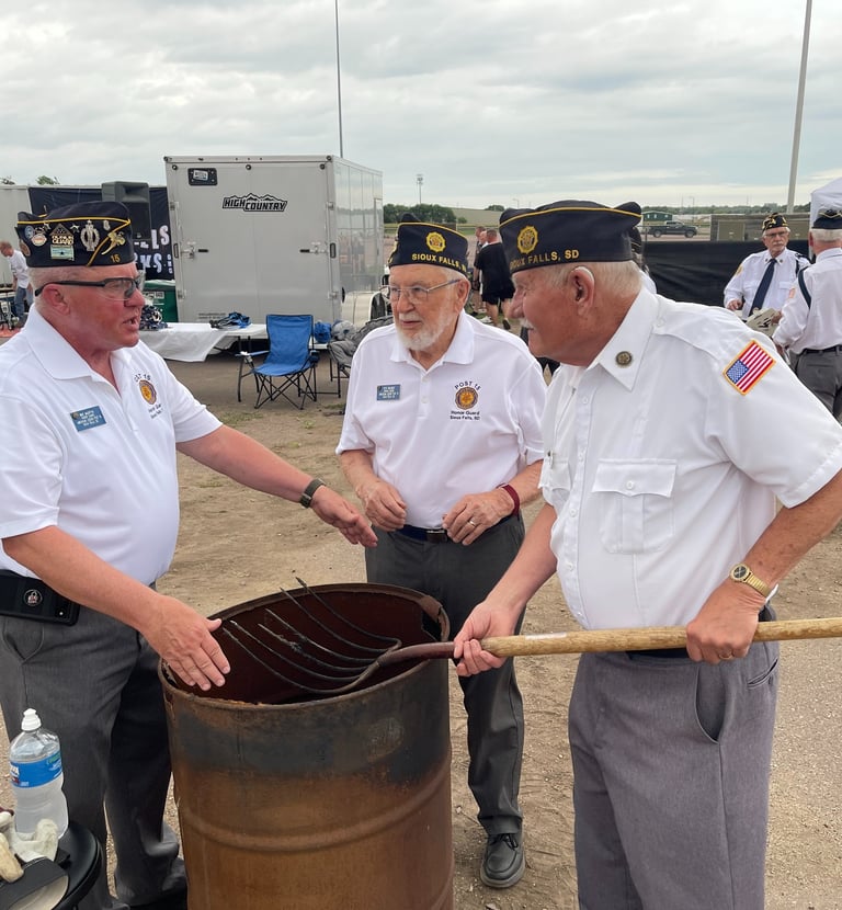 Post 15 member, Bob Puthoff, helping South Dakota Sons of the Legion members Mike Oldfield and Tyler Patch retire the colors at the fair grounds.